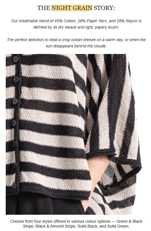 Fashion copywriting for email - to be skimmable, informative, with subtle branding to ensure confident online shopping.